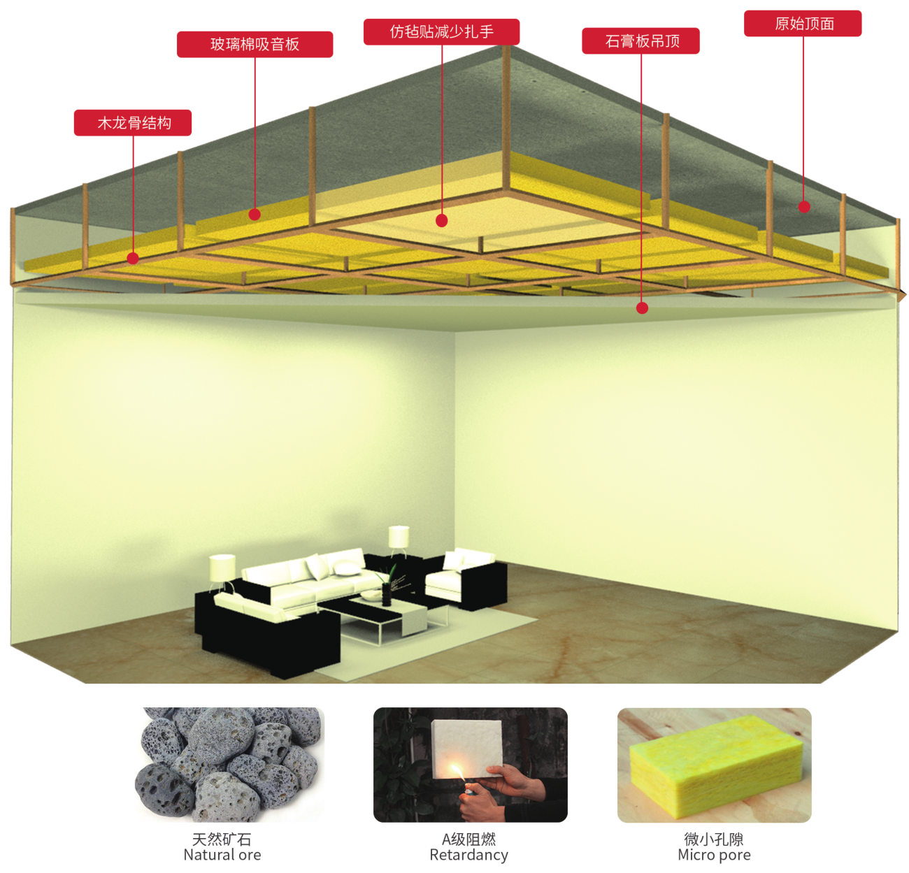 贏勝®天花板隔音隔熱棉屬于多孔吸聲材料,具有良好的吸聲性能,可用于各種高檔商業(yè)建筑天花吊頂吸聲降噪,防止冷凝結(jié)露,節(jié)約能耗。
