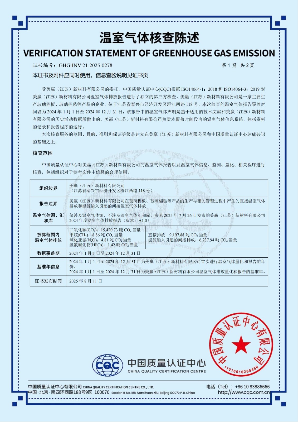贏勝旗下全資子公司美贏(江蘇)新材料有限公司通過 CQC 溫室氣體核查陳述并獲得產(chǎn)品碳足跡認(rèn)證
