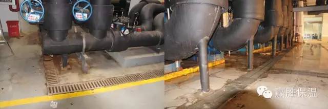 4、地下室冷凍機(jī)房和空調(diào)管廊部位都是管徑較大的管道??臻g小、管道多、閥件多,相當(dāng)一部分管道,閥件之間間距小,這給保溫施工增加難度。甚至有些部位保溫層都不能通過。施工過程中只能是相連兩條管道保溫層相互對(duì)接,對(duì)接部位會(huì)留有空隙,氣密性無法保證,大管徑管道固定支架密。支架木托保溫性能差,施工中保溫層與木托連接不好,間隙處會(huì)凝露。