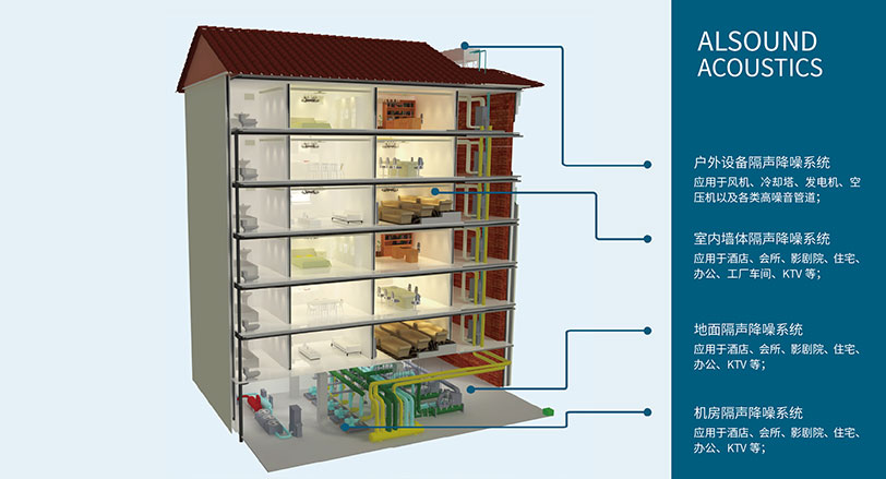 民用建筑是指非生產性的居住建筑和公共建筑,噪聲來源包括建筑外環(huán)境噪聲、建筑內部噪聲、建筑屋面/室外噪聲。 針對不同噪聲來源及不同應用場所,贏勝分別設計制定了戶外設備隔聲降噪系統(tǒng)、室內墻體隔聲降噪系統(tǒng)、地面隔聲降噪系統(tǒng)、機房隔聲降噪系統(tǒng),定向解決民用建筑噪聲問題。